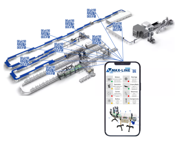 Max-Line connected is het enige systeem in de markt dat alle systemen combineert. Door middel van het scannen van één QR-code die aan de transport conveyor is gehangen worden de klant en leveranciers coderingen van de slijtbare onderdelen zichtbaar.